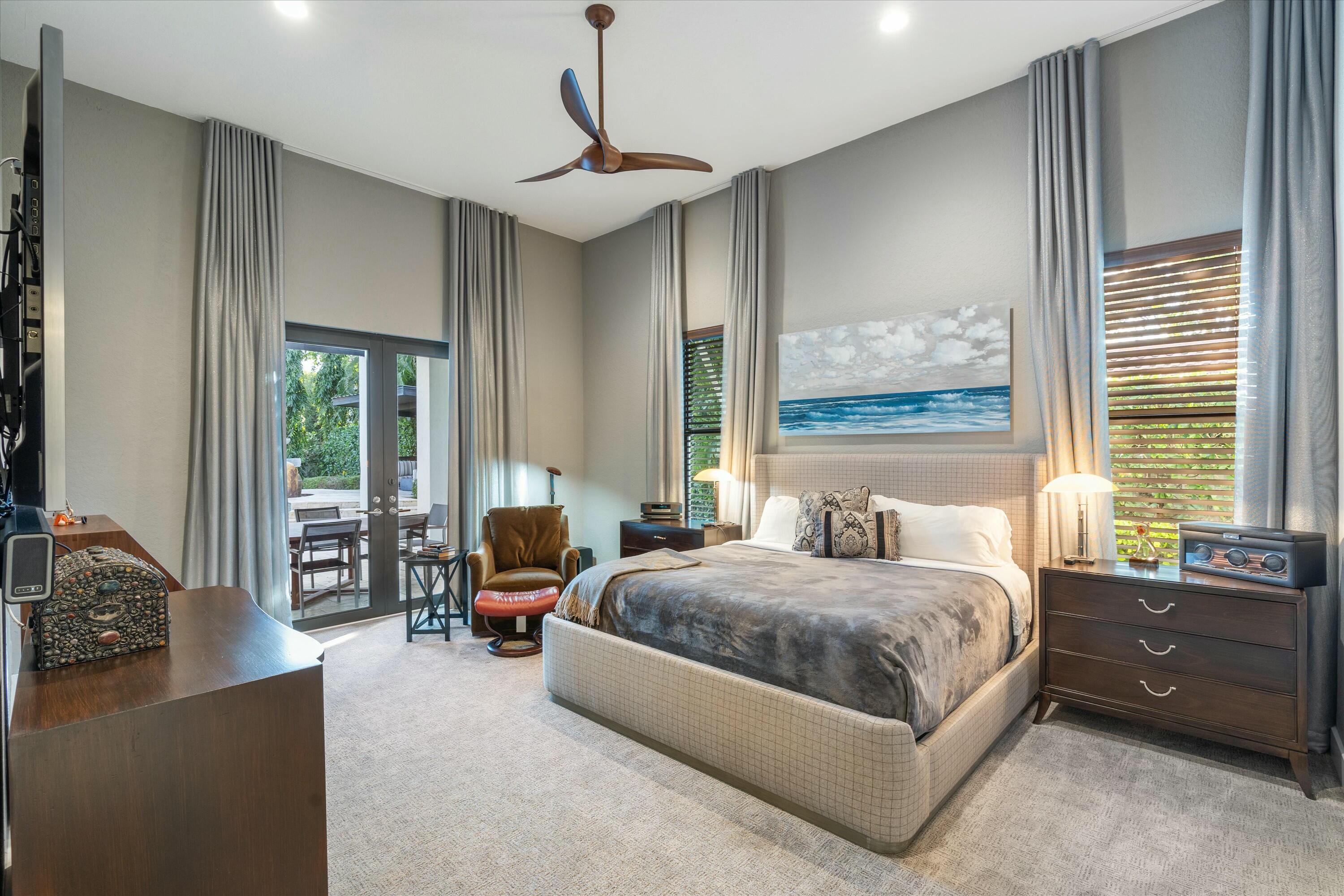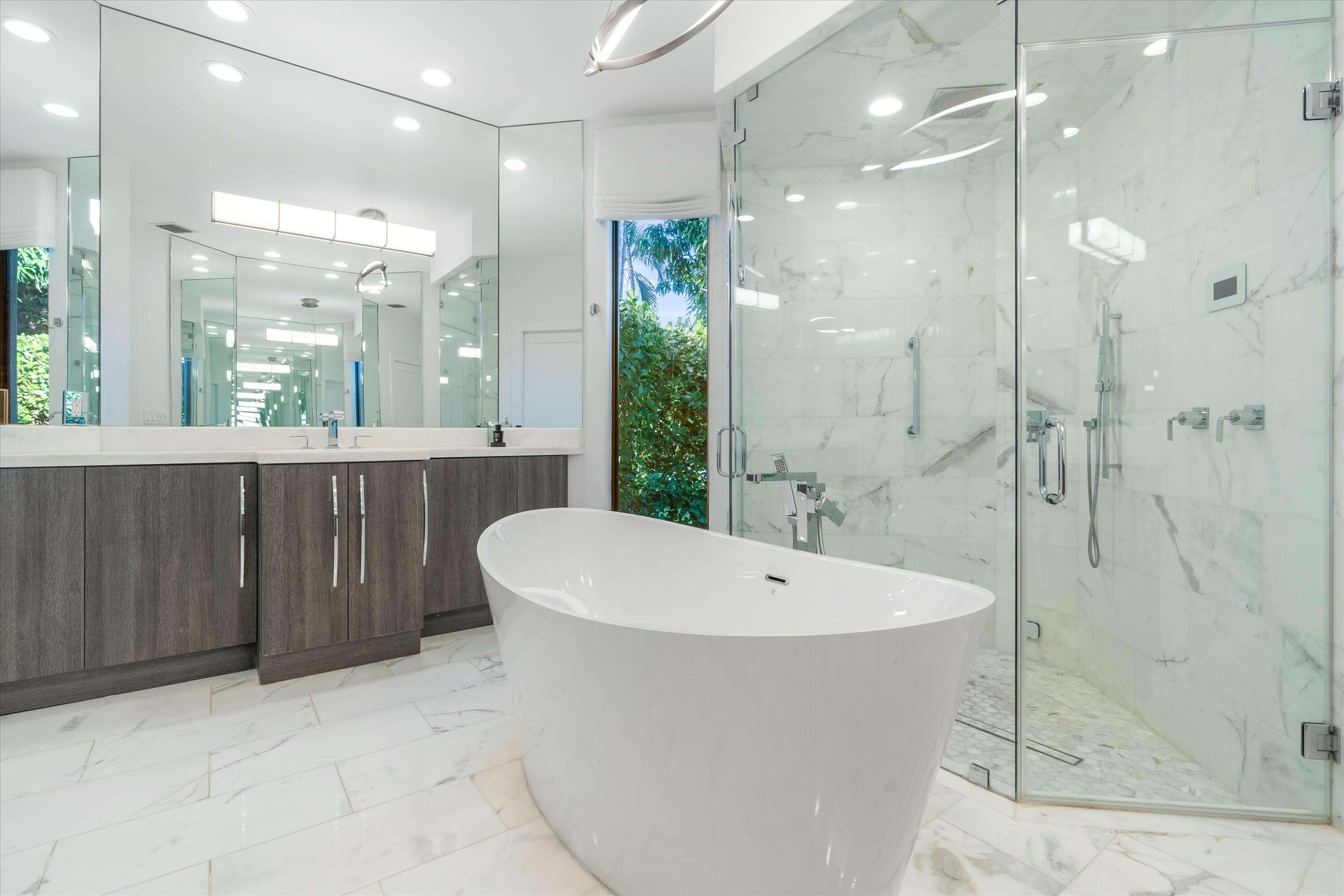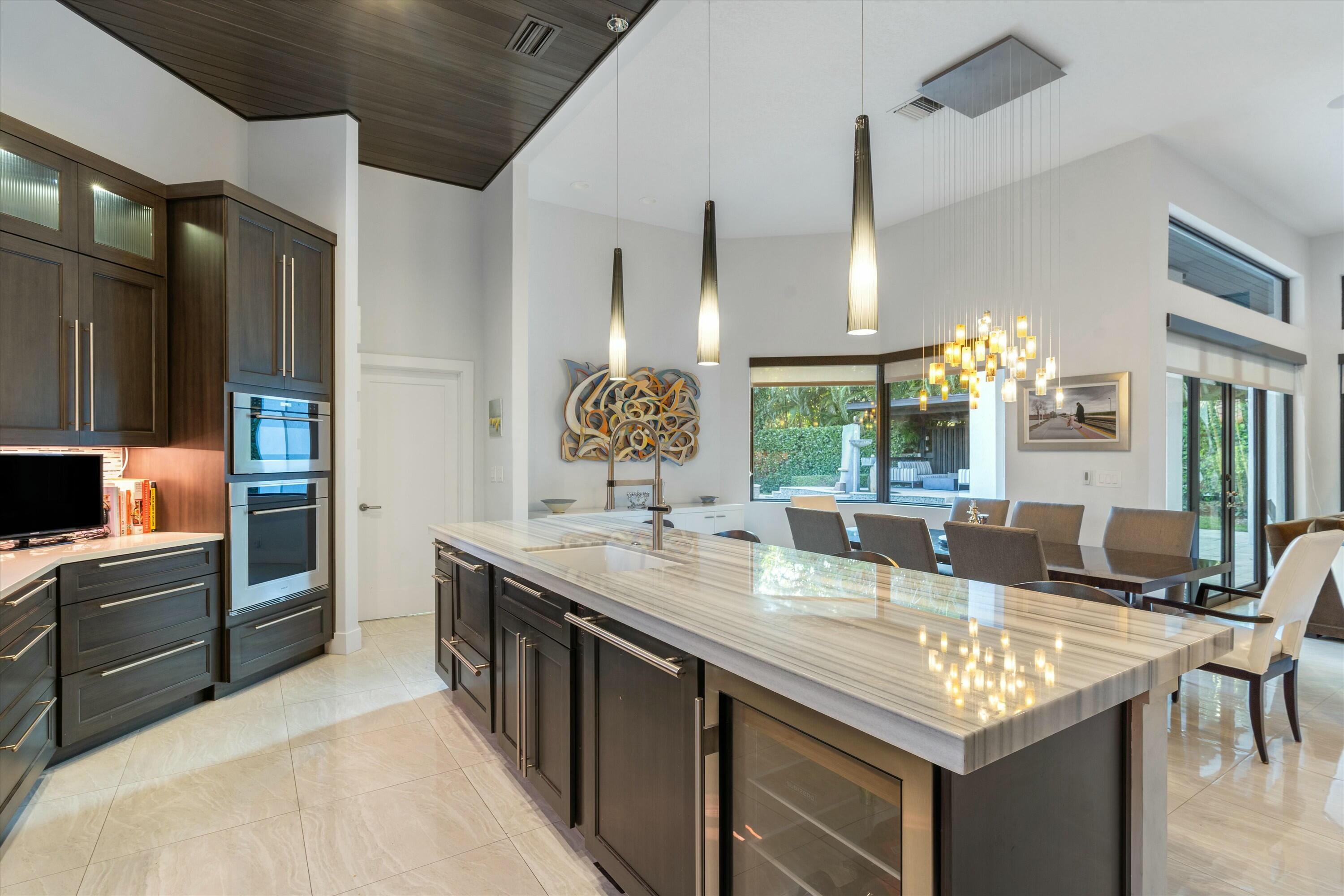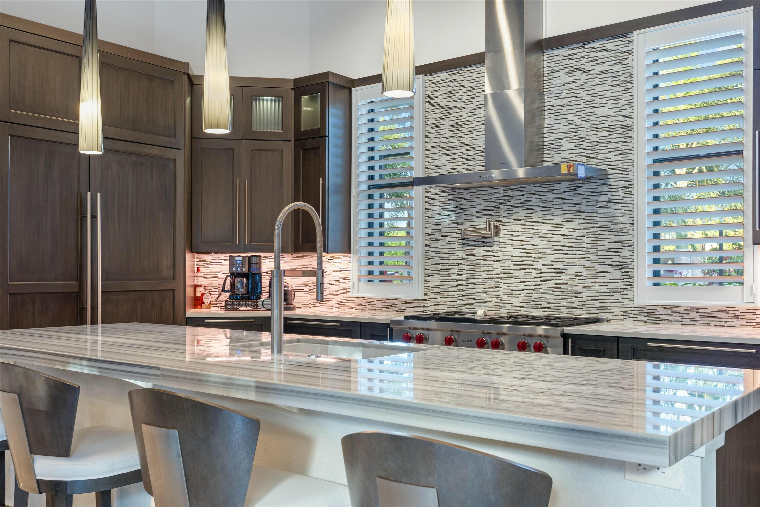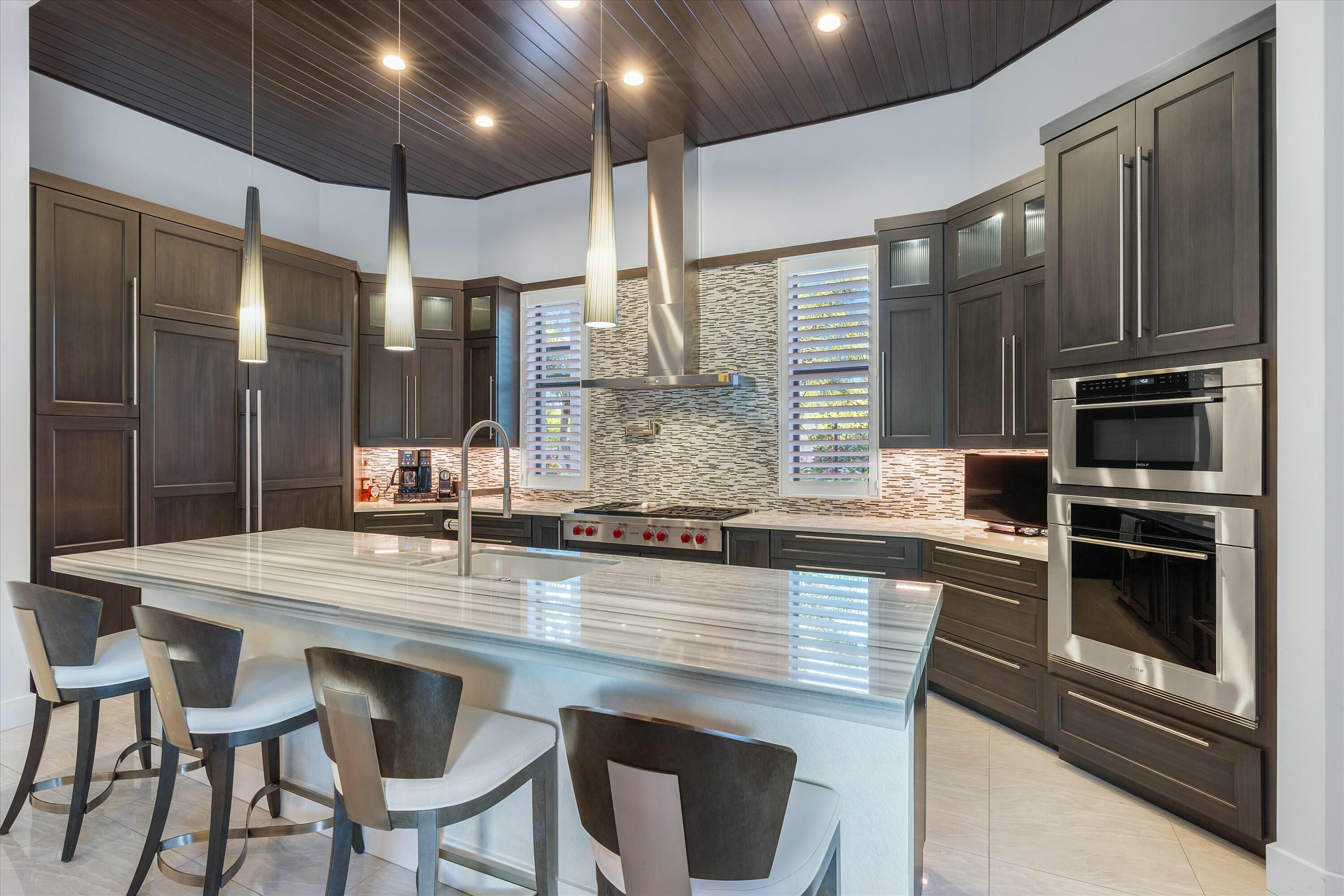 Inside, the main house features soaring volume ceilings and a split floor plan. The kitchen, expanded during the renovation, boasts a sleek tongue-and-groove wood ceiling, custom cabinetry, and elegant quartzite countertops. High-end appliances include a Wolf 6-burner natural gas cooktop with a griddle, a Wolf wall oven and microwave, two dishwashers, a Sub-Zero refrigerator, and a beverage fridge. A hidden wine rack is seamlessly integrated into the cabinetry. The luxurious primary suite, with custom window treatments and a custom-built closet, overlooks the pool and fountain. The spa-like primary bath showcases marble finishes, a standalone tub with a bubbler, a steam shower, and dual vanities.