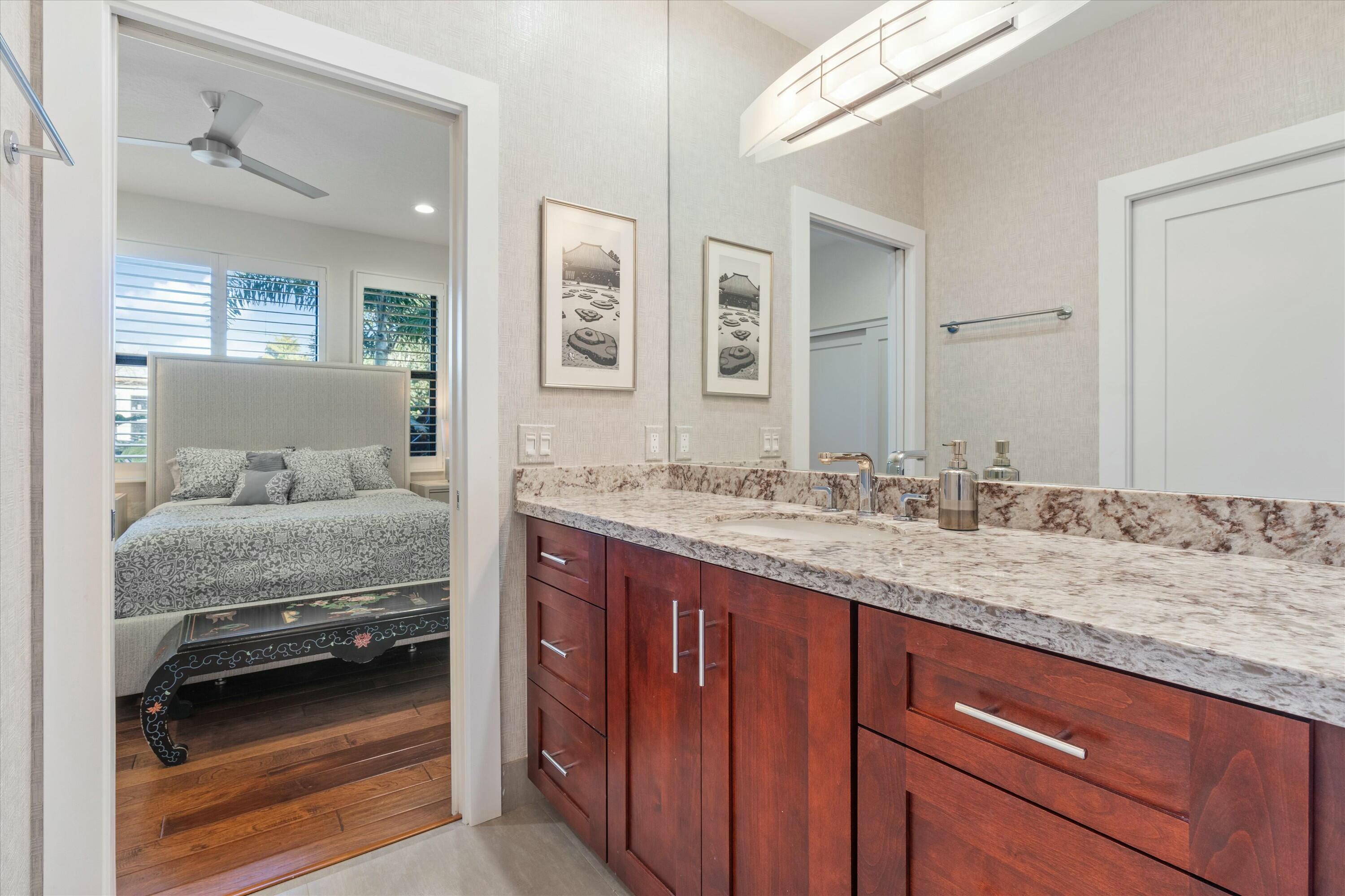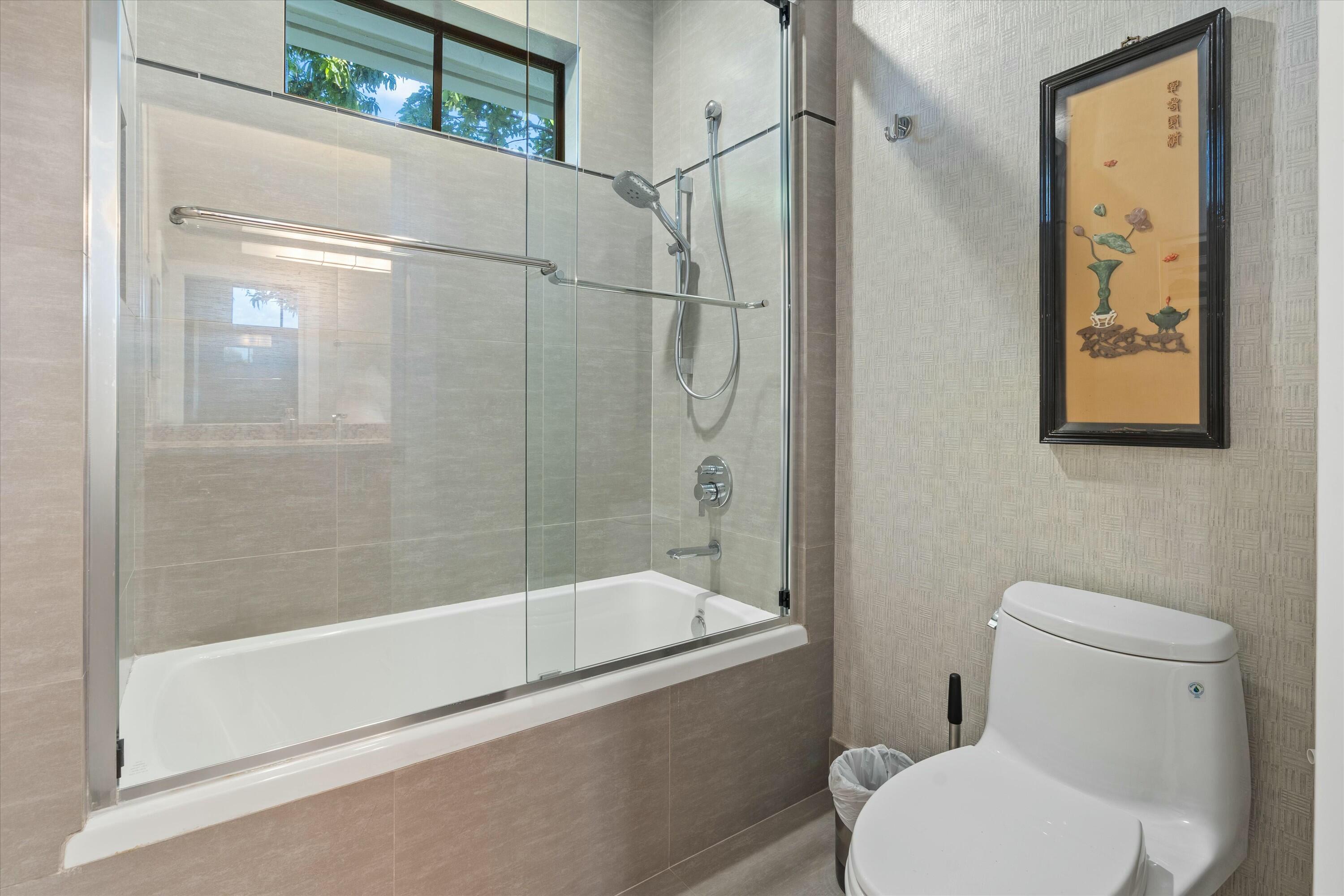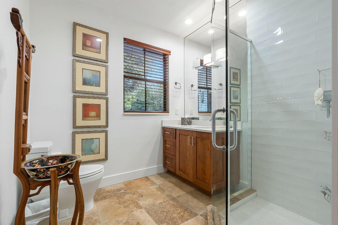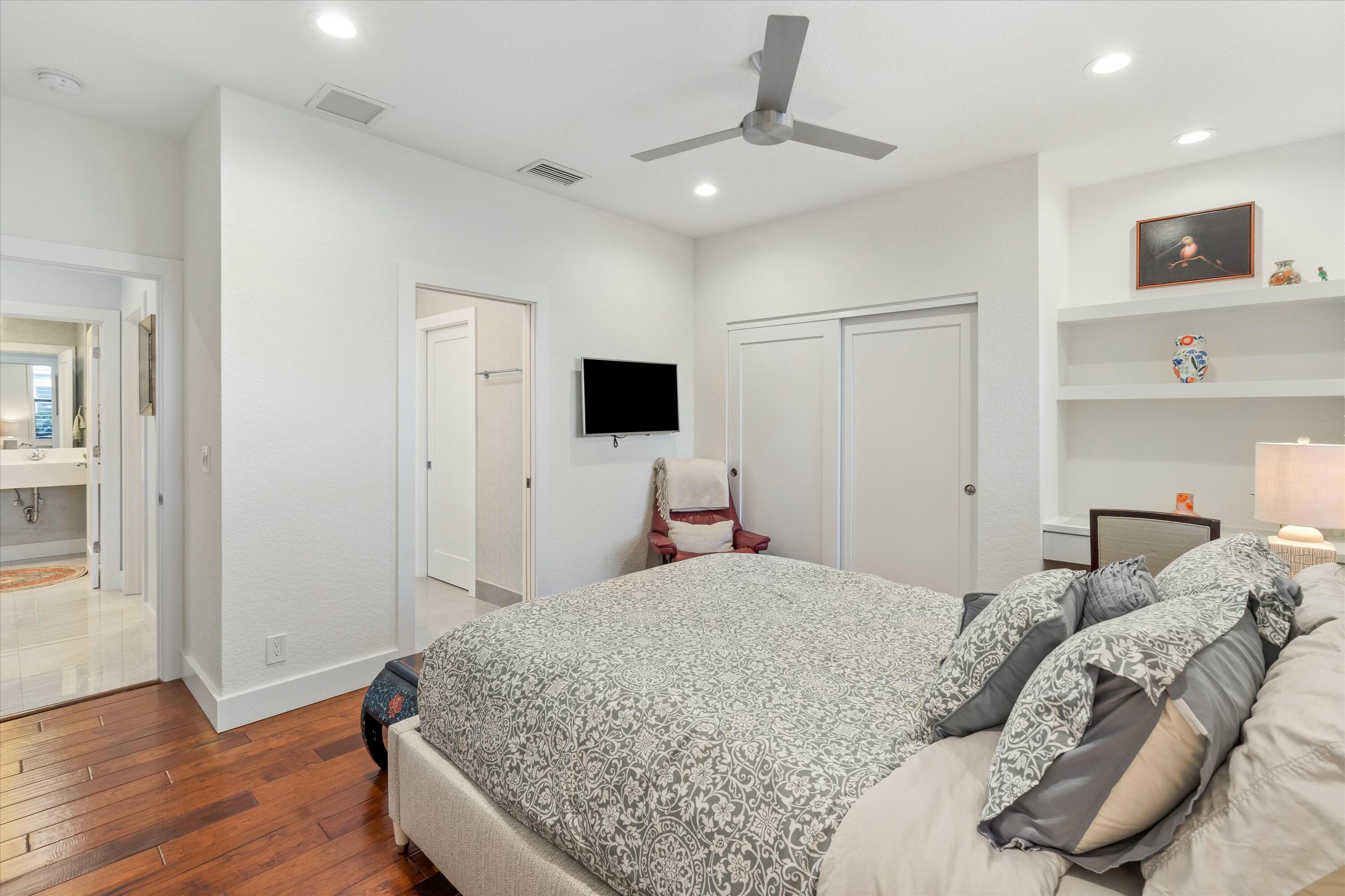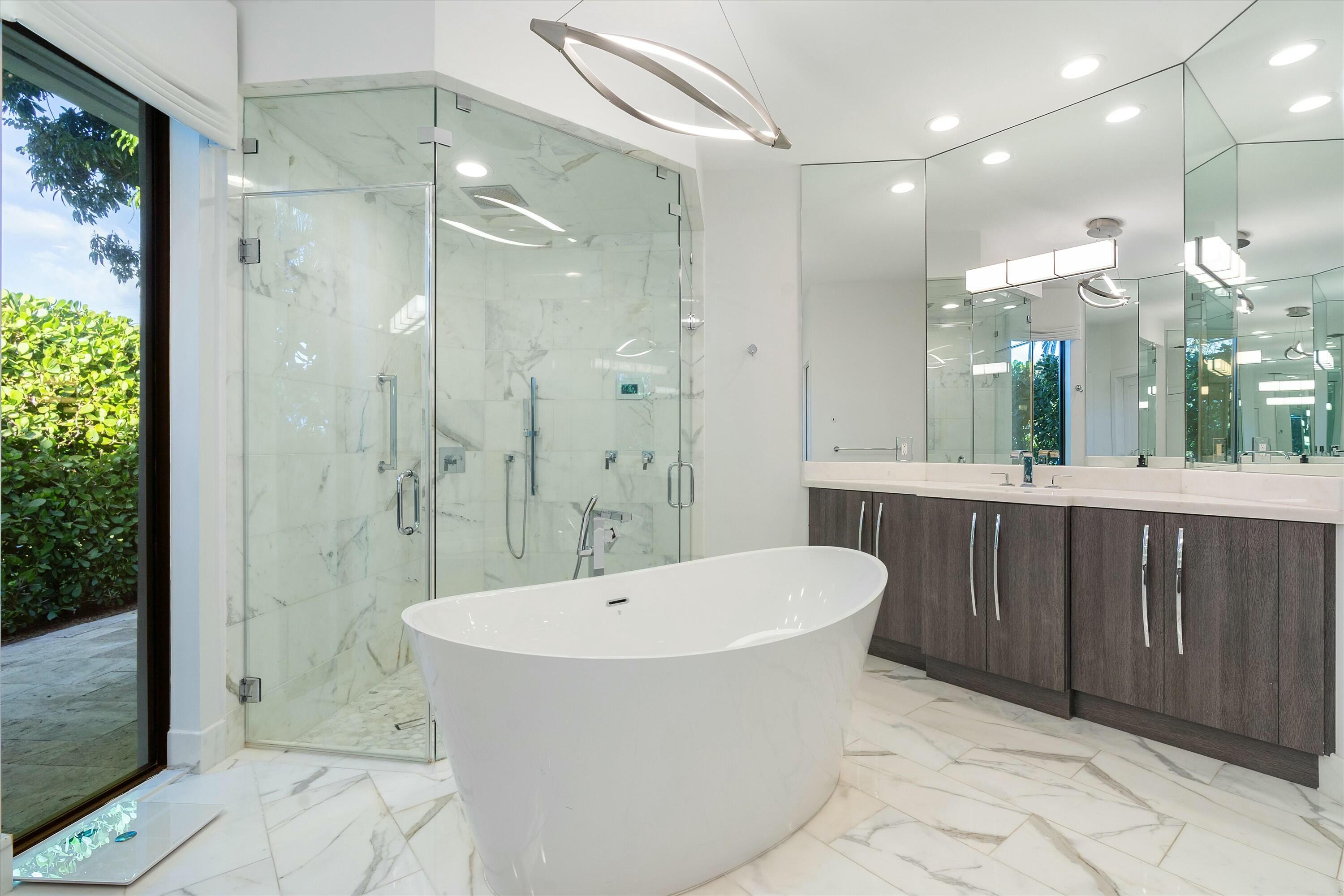 Inside, the main house features soaring volume ceilings and a split floor plan. The kitchen, expanded during the renovation, boasts a sleek tongue-and-groove wood ceiling, custom cabinetry, and elegant quartzite countertops. High-end appliances include a Wolf 6-burner natural gas cooktop with a griddle, a Wolf wall oven and microwave, two dishwashers, a Sub-Zero refrigerator, and a beverage fridge. A hidden wine rack is seamlessly integrated into the cabinetry. The luxurious primary suite, with custom window treatments and a custom-built closet, overlooks the pool and fountain. The spa-like primary bath showcases marble finishes, a standalone tub with a bubbler, a steam shower, and dual vanities.